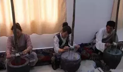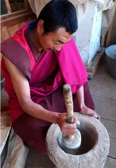 技师们用最原始的工具舂制唐卡颜料
