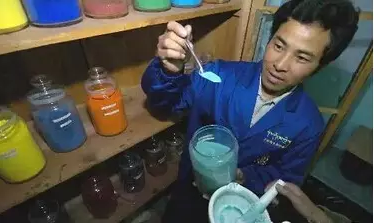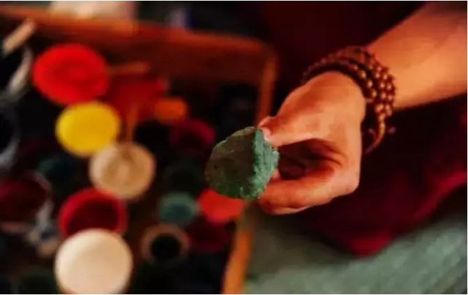 画师展示绿松石原石制成的绿色矿物颜料