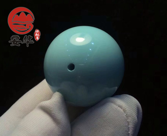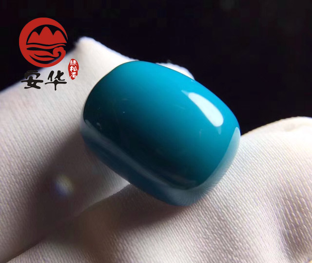 玉化料,顾名思义,就是如玉般的料子。这种料子的瓷度很高,玉质感很强,质地细腻、紧密,颜色沉稳、清透,光泽柔和、均匀、饱满,给人一种油润的感觉。区分时,可打光观察。普通的绿松石是半透明的,正常情况下打光不透,而玉化料在厚度适中的地方打光,会散发出翠色的清澈绿光,能达到半透明状态。