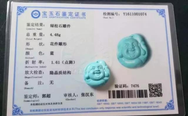 第二,若是绿松石,按照国家标准是否经过处理。绿松石按照现在的宝玉石鉴定的国家标准,经过有机胶或无机胶充填过的绿松石,会在鉴定结果里注明“处理”,如果是天然的则直接标注“绿松石”。